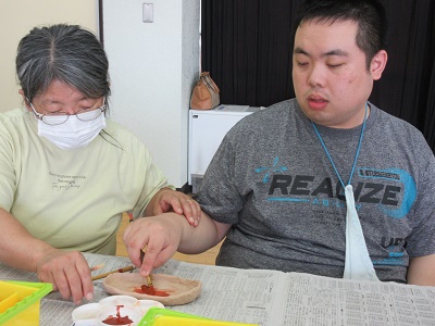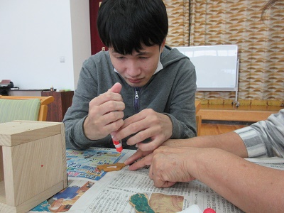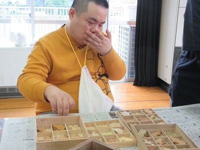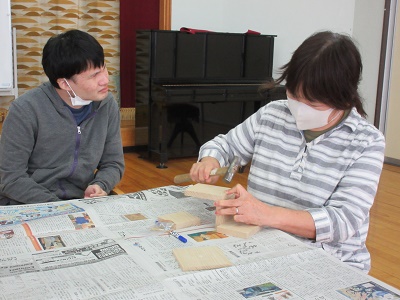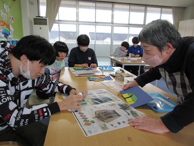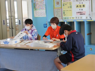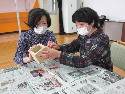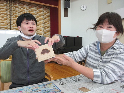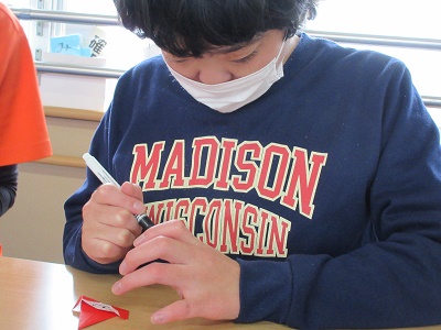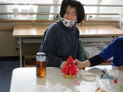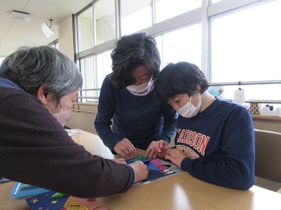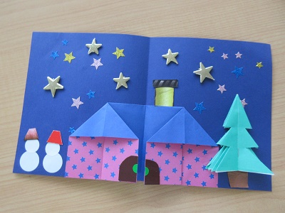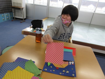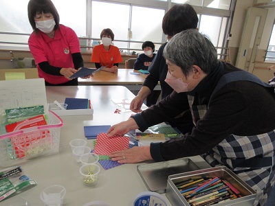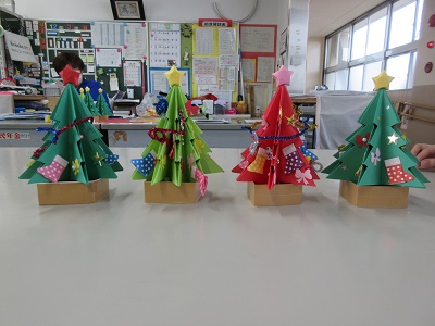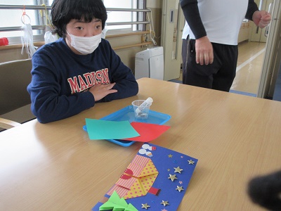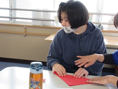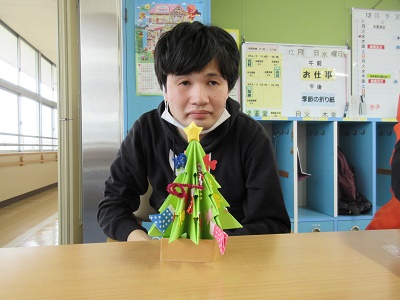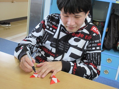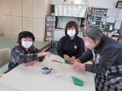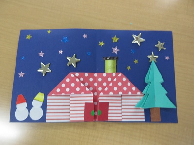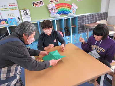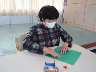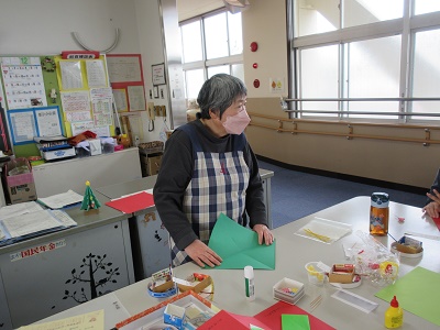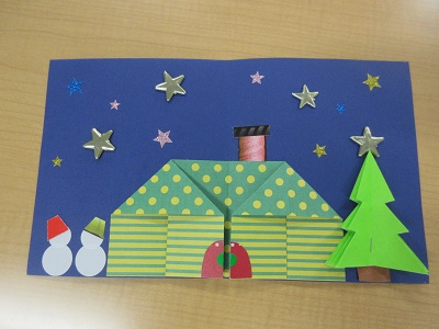 第1回 季節の折り紙 園生は折り紙を折ったりシールを貼ったりと、職員と一緒に楽しみながらクリスマスカードづくりに取り組みました。講師の先生の分かりやすい教え方のおかげで、どのカードもとても上手に仕上がりました。