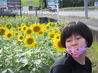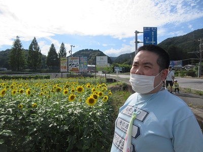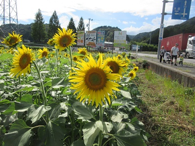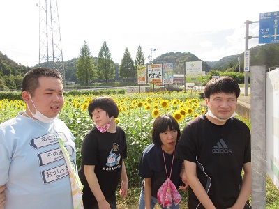 ドライブ 池田道の駅 ひまわり畑 ひまわり畑を見学すると、どの花も同じ方向を向いてきれいに咲いていました。写真撮影では、まわりのひまわりが気になってなかなか撮れない園生の姿もあり、微笑ましいひとときでした。最後に、道の駅をゆっくり散策しました。